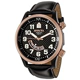 The Invicta Men's II Collection Watch features a classic style that will flawlessly complement your favorite pair of jeans. The round, black ion-plated stainless steel case is topped with an 18k rose gold bezel. A black dial displays luminous Arabic numerals at each hour position, with the Invicta logo at the twelve o'clock position, and a rotating inner bezel along the outside edge of the dial. Luminous, rose-gold-toned hour and minute hands are accompanied by a rose-gold-toned second hand and are easy to read against the black carbon fiber dial. A unique curved date window stretches from the five to nine o'clock hours. The black leather band adjusts for a comfortable fit and securely fastens with a buckle clasp. This timepiece offers Swiss quartz movement and is protected by a flame-fusion crystal. The watch is water resistant to a depth of 330 feet (100 meters).II CollectionIn the wake of up to the minute technology, optimal construction, and a spectrum of inventive design choices y